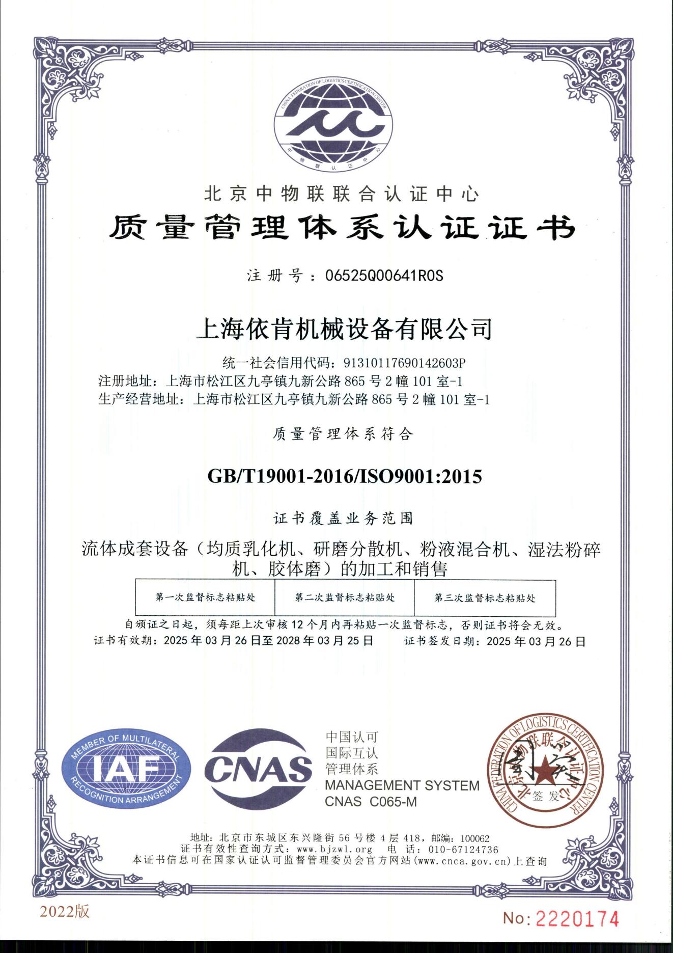 上海太阳集团tyc4633机械自成立以来,一直致力于为客户提供高品质的流体高剪切混合设备及解决方案。此次通过 ISO 9001 认证,是我们在追求卓越品质道路上的重要一步,也将进一步推动我们在产品和服务上不断提升,为客户创造更大的价值。